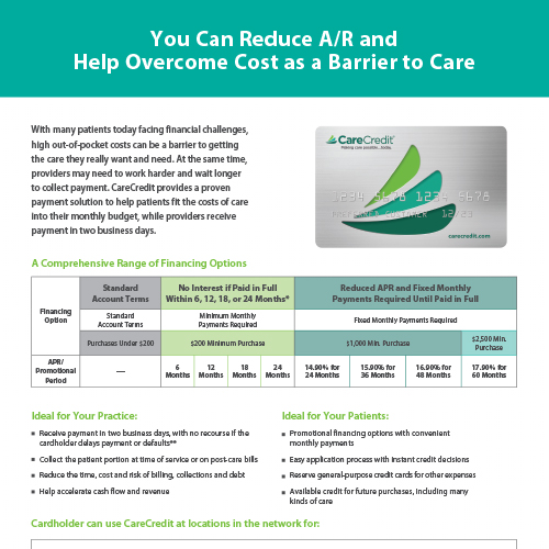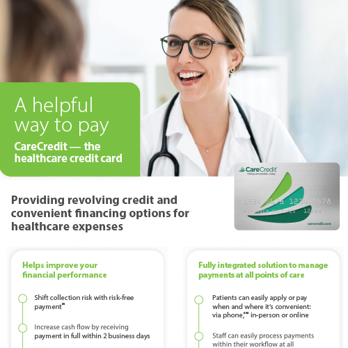 Financial challenges and high out-of-pocket costs can be a barrier to getting the care patients want and need. CareCredit provides proven payment solutions to help patients fit the cost of care into their monthly budgets with payments to providers in two business days.