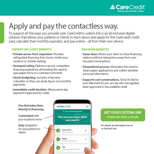 CareCredit's custom link is an all-inclusive digital solution that allows your patients to learn about and apply for the CareCredit credit card calculate monthly payments and pay online, all from their own device.