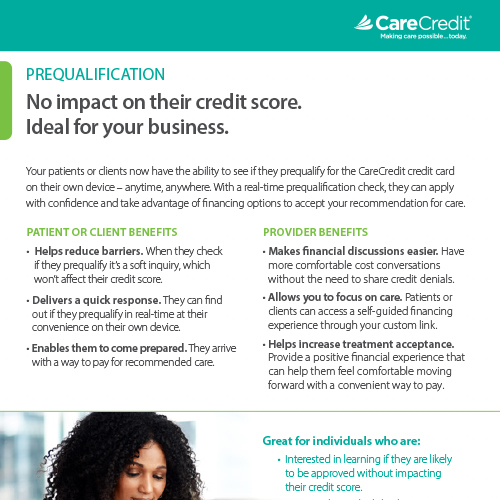 Patients can see if they prequalify for the CareCredit credit card. With real-time prequalification check, patients can apply with confidence and take advantage of financing options that make it easier for them to move forward with the care they want and need.